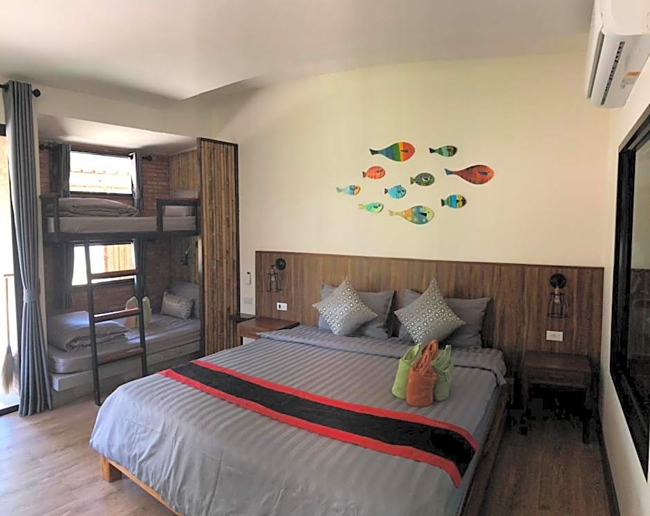 This bungalow features a bunk bed with a queen-sized bed on the lower bunk and a single bed on the top bunk.